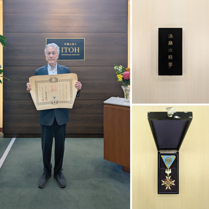 2025/11/25令和7年秋の叙勲で、弊所意匠部顧問・弁理士 川崎芳孝が瑞宝小綬章(経済産業行政事務功労)を受章しました。